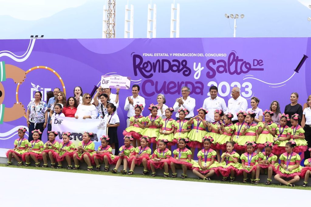 Y es que, en el escenario, en plena pista de tartán, ahí donde se cruza la leyenda “Mensajeros de Paz”, en letras color morado y con el colibrí institucional del DIF en la gigantesca mampara, los niños y niñas hacen gala de destreza y habilidad con la cuerda: como Jesús Roberto de la escuela Mártires de la Revolución de Miguel Alemán, que con pura música de banda impresiona con su rutina para asegurarse el primer lugar en salto de cuerda individual.