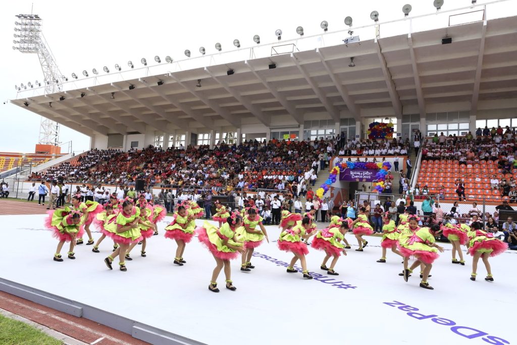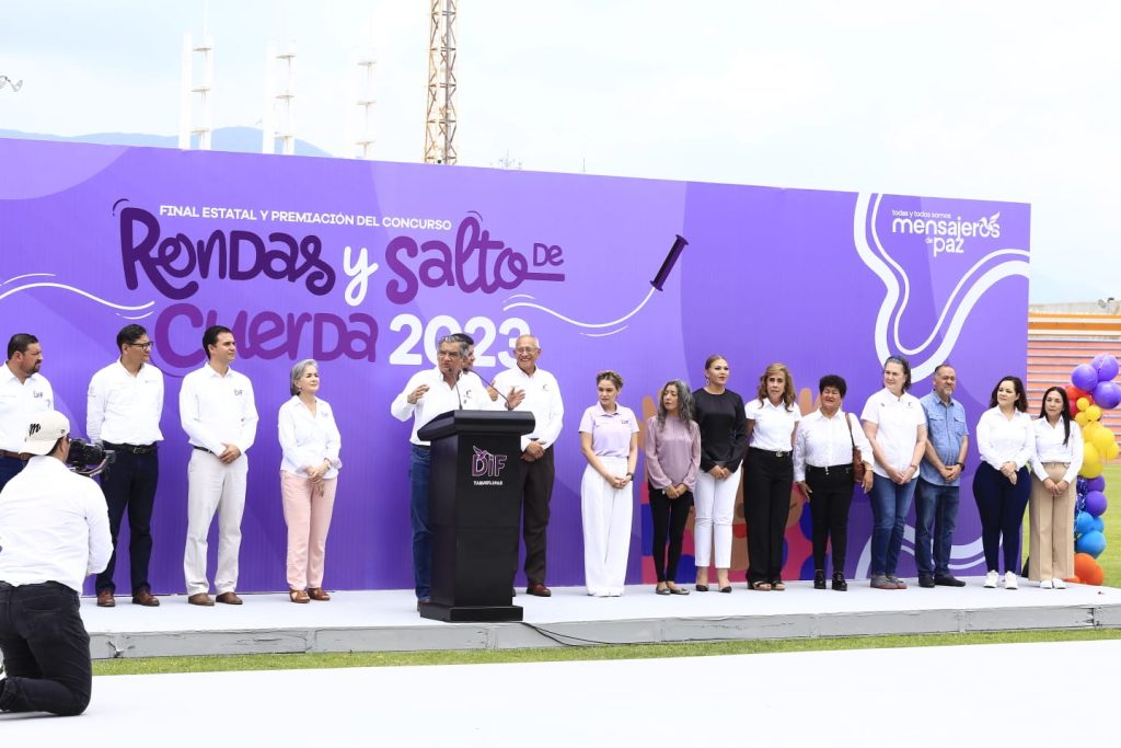 Ciudad Victoria, Tamaulipas.- Hoy, el estadio Marte R. Gómez, se cimbró con aplausos y porras dedicadas a niñas y niños que con júbilo recuperan la tradición de sus juegos infantiles; esta mañana la tribuna vibra con los representativos escolares que participan en la final estatal del Concurso de Rondas y Salto de Cuerda, en medio de un ambiente multicolor que se inunda con música muy nuestra, al ritmo del Cuerudo Tamaulipeco, de la Picota de San Carlos y con el Tampico Hermoso a todo volumen.
