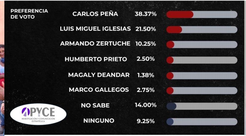 EN LO general, la encuesta define que, los aspirantes a la presidencia municipal en Reynosa, por el momento se encuentran en las siguientes posiciones: Carlos Peña con el 38.37%, Luis Miguel Iglesias con el 21.50%, Armando Zertuche Zuani con un 10.25 %, Humberto Prieto Herrera con 2.50 %, Magaly Deandar con 1.38 %, Marco Gallegos con 2.75 %, y con un 14.00 % no sabe y el 9.25 % por ninguno.