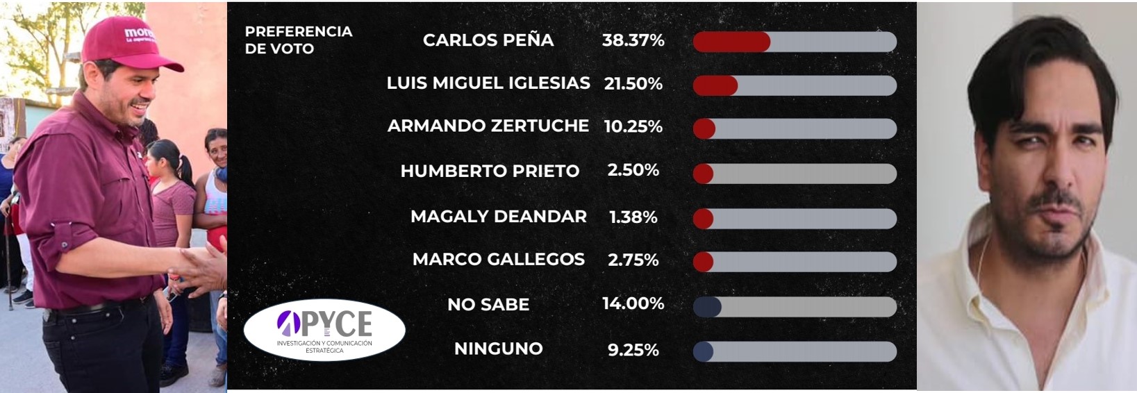 CONFORME se va acercando el tiempo, para definir quién será el Candidato de la coalición de “Juntos Sigamos Haciendo Historia”, para la alcaldía de Reynosa, “esta interesante disputa por el pase a la final”, la encabezan Carlos Peña Ortiz con un 38.37 % y Luis Miguel Iglesias Elizondo con un 21.50 %, como lo confirma y refleja la encuesta de (OPICE Investigación y Comunicación Estratégica), bajo el sistema metodológico de “entrevista a personas cara a cara” en vivienda, garantizando el anonimato de los entrevistados y la geolocalización, utilizando el dispositivo móvil (CAPI), cuya medición electoral, podría variar, por la sólida aceptación que tienen estos dos contendientes entre el contexto ciudadano reynosense.