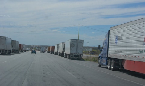 Peligrosas filas irregulares de camiones de carga se forman al llegar al Kilómetro 26, sin que autoridad de Gobierno Federal pueda logra el orden.