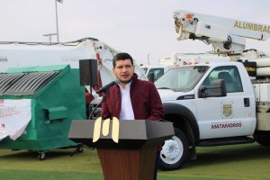 Matamoros, Tamaulipas – En un esfuerzo por transformar los servicios públicos de Matamoros, el alcalde José Alberto Granados Fávila encabezó esta mañana la entrega de cinco camiones compactadores, contenedores para desechos y equipo de alumbrado público, ante la presencia de autoridades locales, trabajadores de servicios públicos y la comunidad en general.