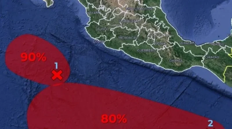 Hasta las 6:00 de la mañana de este sábado, la primera zona de baja presión se encuentra al Suroeste de Jalisco y Colima, además mantiene un 90% de probabilidades de convertirse en ciclón tropical en las próximas 48 horas y en siete días.
