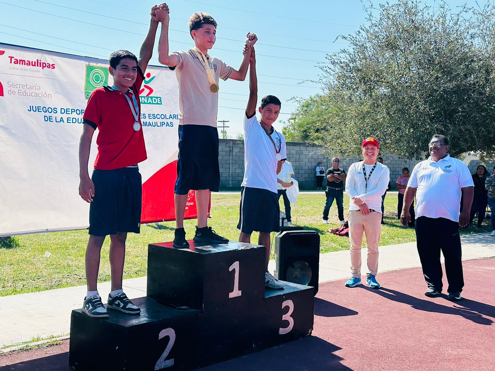 La maestra Samanta Marial Guerra Chávez, directora de la Telesecundaria “Agapito González Cavazos”, dijo que sus alumnos ganadores son: David Díaz Ríos como primer lugar en salto de longitud y Angel Eduardo Garza Jaramillo como primer lugar en relevos de cuatro por cien.