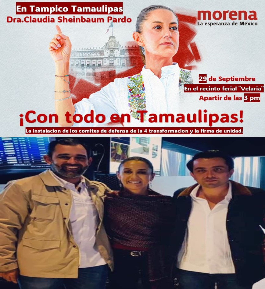 LA PRESENCIA de la Dra. Sheinbaum Pardo en Tampico, lleva como firme propósito, formalizar “la instalación de los Comités de defensa de la 4-T” y al mismo tiempo consolidar “la firma de la unidad”, motivo por el cual, en este acto que, será de enorme relevancia y trascendencia política entre el Morenismo representado por la dirigente estatal Yuridia Iturbe Vázquez, se estará contando también con la estancia de los presidentes municipales, diputados locales, así como legisladores federales y los Senadores del Morena, quienes “como una sola familia”, le harán patente su solido respaldo a quien, sin lugar a dudas, habrá de dirigir los destinos de todos los mexicanos a partir del 2024.