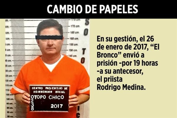 Rodríguez es el segundo ex Gobernador de Nuevo León en cinco años que pisa la cárcel tras concluir su mandato, después de que el 26 de enero de 2017, el priista Rodrigo Medina estuvo preso durante 19 horas en el extinto Penal del Topo Chico, acusado de peculado y daño patrimonial, precisamente durante el Gobierno de “El Bronco”.