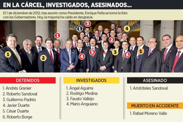 En total, 28 Mandatarios estatales de un total de 64 que fueron elegidos entre 2010 y 2022 fueron detenidos, investigados o asesinados. De ellos, 15 han ido a la cárcel en ese periodo, aunque otros dos también fueron aprehendidos, pero ocuparon el puesto antes de 2010: Tomás Yarrington y Rosario Robles.