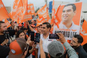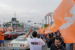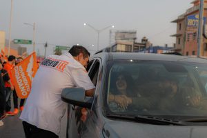 Roberto Lee, candidato naranja a presidente Municipal y Leticia Salazar, se toparon en un pegoteo de calcas en la calle Sexta y Canalés, pero la mancha naranja se impuso con la alegría que les caracteriza y la aceptación de los ciudadanos.