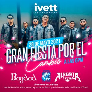 La candidata del PAN a la presidencia municipal de Matamoros Ivett Bermea, invita a todas las familias matamorenses a disfrutar de un momento muy agradable en la Gran Fiesta por el Cambio y su cierre de campaña en el que se presentará entre otros grupos La Banda Limón, Alegría de Corazón, Grupo Bagdad, Grupo Cariño y Grupo Belén.