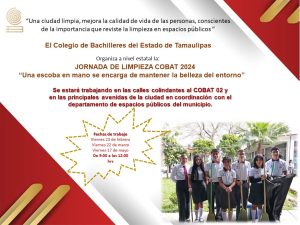 A fin de concientizar a los jóvenes sobre el cuidado del medio ambiente y qué mejor con mantener las áreas limpias en los alrededores de nuestro plantel, este viernes 23 de febrero tendremos la Jornada de Limpieza Cobat 2024 “Una escoba en mano se encarga de mantener la belleza del entorno”, informó el director del Colegio de Bachilleres de Tamaulipas plantel 02, maestro José Guadalupe Gallardo Hernández, quien además dijo que esta jornada se hará de manera simultánea en los 64 planteles que pertenecen a la Dirección General de Colegios de Bachilleres del Estado de Tamaulipas y que dirige atinadamente el maestro Rubén Ely Ramírez Rivas.