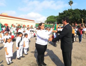 Enseguida de manera simbólica entregó la Enseña Nacional a la maestra Sandra Georgina Cantú Arellano, quien a su vez abanderó a la pequeña escolta del Jardín de Niños “Alfonso Guevara Casanova”; recibió bandera el niño Edy Jaret García Bonilla.