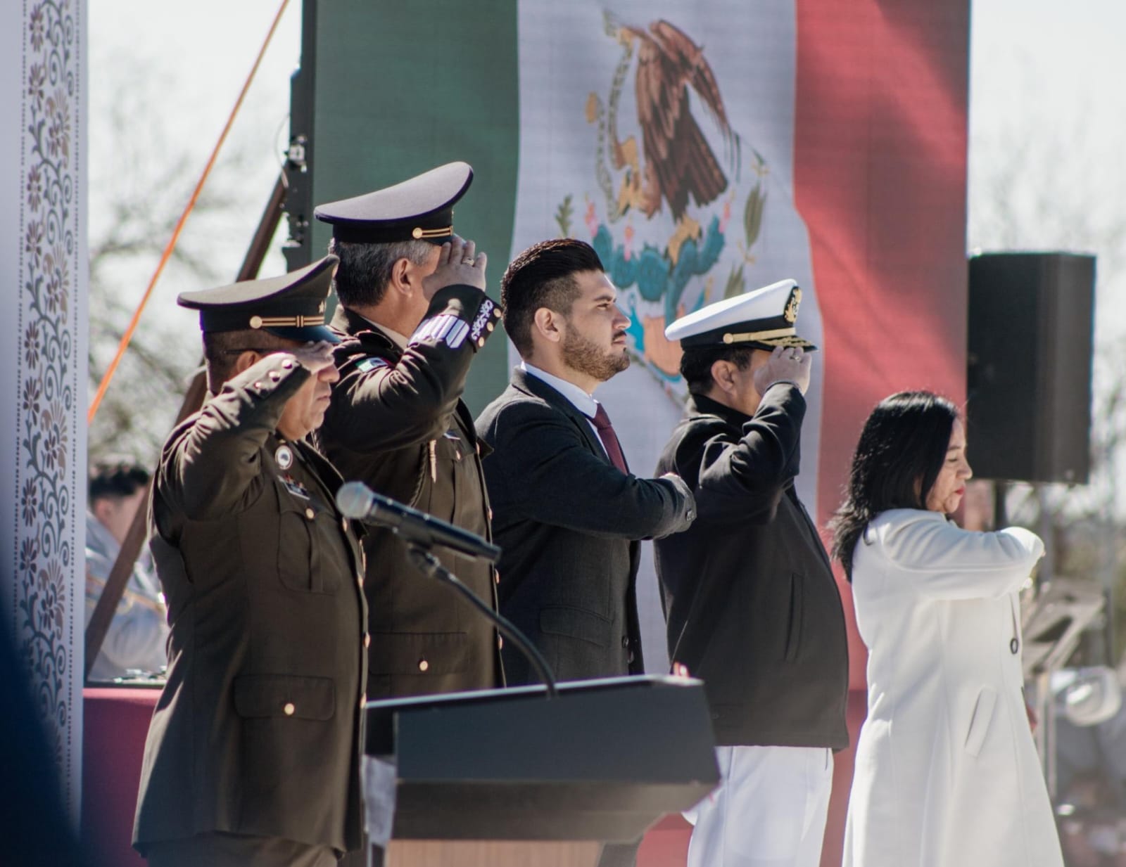 En esta ceremonia de honores estuvieron presentes alumnos de diversas instituciones educativas quienes tomaron protesta de honrar a los símbolos patrios después de ser abanderados por autoridades militares y municipales como el Contralmirante de Estado Mayor; Cesar Gustavo Ramírez Torralba, quien es Comandante de la Primera Zona Naval, y por el alcalde de Matamoros Beto Granados.