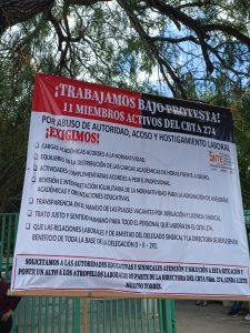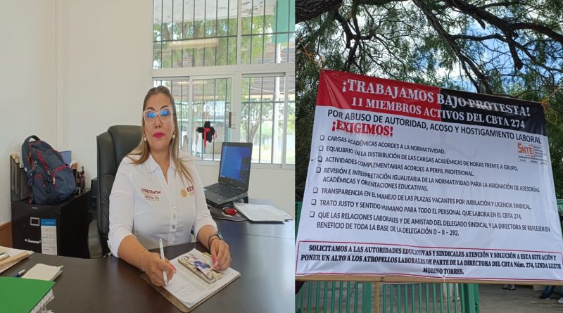Un grupo de maestros del Cbta 274 en Matamoros trabajan bajo protesta porque denuncian abuso de autoridad, acoso y hostigamiento laboral por parte de la directora del plantel, maestra Linda Lizeth Moreno Torres.