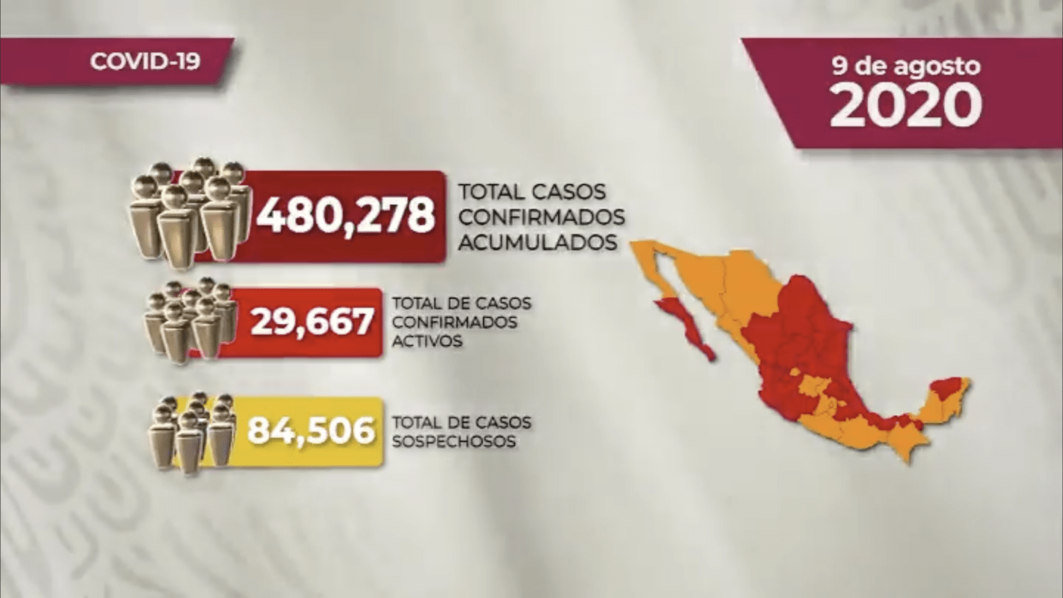 La Secretaría de Salud (SSa) reporta hasta este domingo 9 de agosto, 480 mil 278 casos acumulados de Covid-19 en nuestro país, así como 52 mil 298 muertes a causa del nuevo coronavirus.