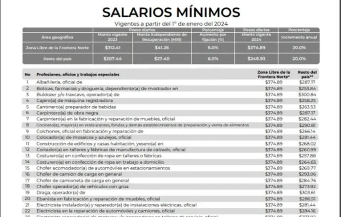En el desglose del nuevo tabulador de salarios mínimos, en el renglón de la Zona Libre de la Frontera Norte se detalla de manera precisa el nuevo salario a devengar de acuerdo a la profesión, oficios y trabajos especiales.