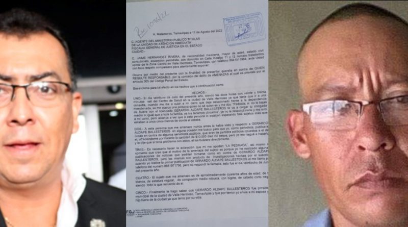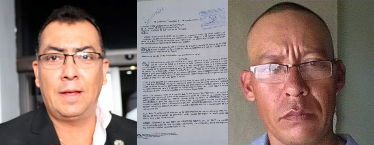 EL PERIODISTA Jaime Hernández Rivera, el pasado 11 de agosto del presente año, denunció ante la Agencia del Ministerio Público de (la unidad de atención inmediata) en Matamoros, dependiente de la FGJE al ex alcalde de Valle de Valle hermoso y actual Magistrado del Supremo Tribunal de Justicia del Estado LIC. GERARDO ALDAPE BALLESTEROS, porque señala que, el pasado 21 de julio, “al salir en el Centro de Salud” a donde fue a consultar, “se le acercó una persona”, la que dijo no conocer, diciéndole: “Pedrada, sino le bajas de huevos” con el Lic. Gerardo Aldape “te va a cargar la chingada” a ti y tu familia.