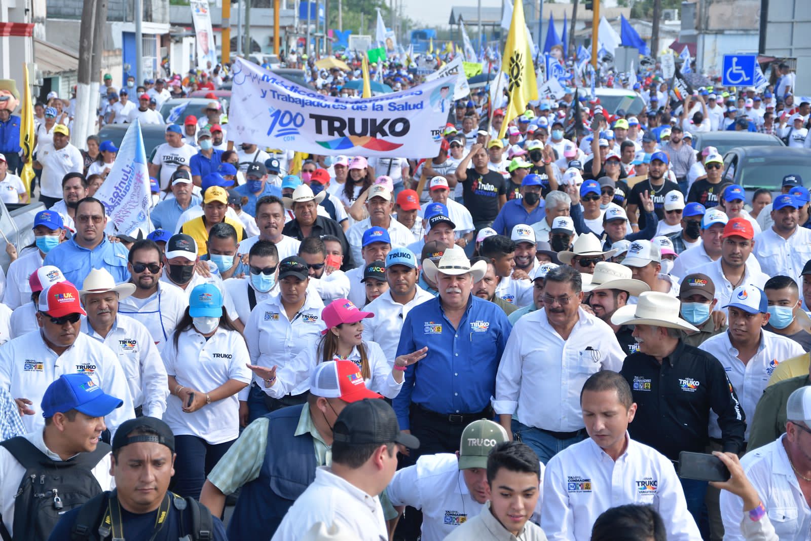 Ni los 38 grados que marcaba el termómetro impidieron que un mar de personas se reuniese a un costado de la plaza principal, muy cerca de la presidencia municipal donde César Verástegui ha despachado dos veces como alcalde y hoy llega como el candidato de la coalición “Va por Tamaulipas”.